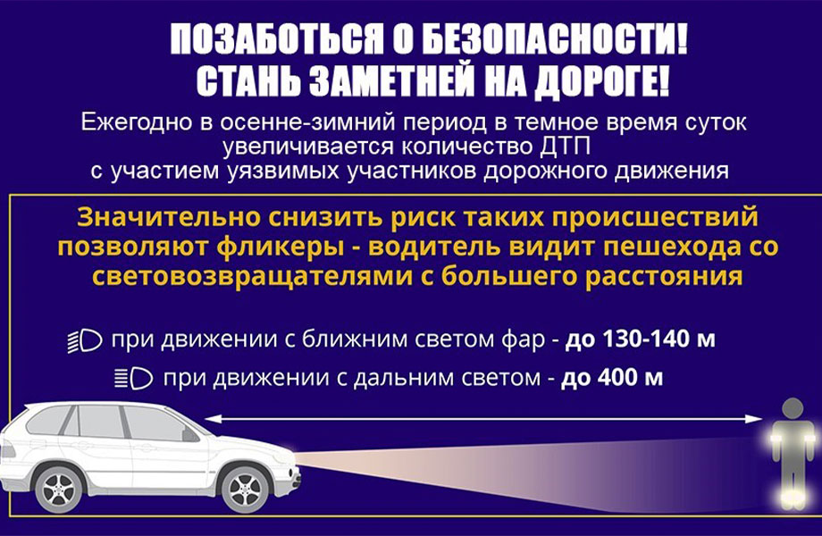 И помните, для водителя автомобиля, человек в тёмной одежде заметен на расстоянии 25-30 метров при ближнем свете фар. Одежда же со светящимися вставками позволяет заметить пешехода или велосипедиста на расстоянии 130-140 метров. При дальнем свете фар катафоты, бликующие фликеры «светятся» на расстоянии до 400 метров.